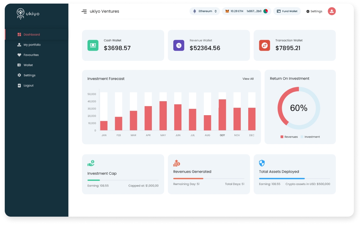 In technical terms, ukiyo Ventures are off-balance-sheet vehicles that are created by ukiyo Labs consisting of multiple users to finance specific projects or ventures without increasing the debt burden of the sponsoring firm or diluting its existing shareholders. By reallocating the risk of a single investor to multiple investors, Ventures provides users access to investment opportunities that they may not have otherwise had access to. Its goal is to provide the everyday investor a new source of revenue generation. On the other hand, it allows capital to move swiftly across borders, and reallocate them in a non-custodial manner thorugh the use of smart contracts and API's.